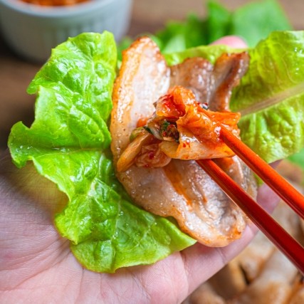 香ばしく焼いた厚切り豚バラ肉を、サンチュに包んでがぶりっ!!