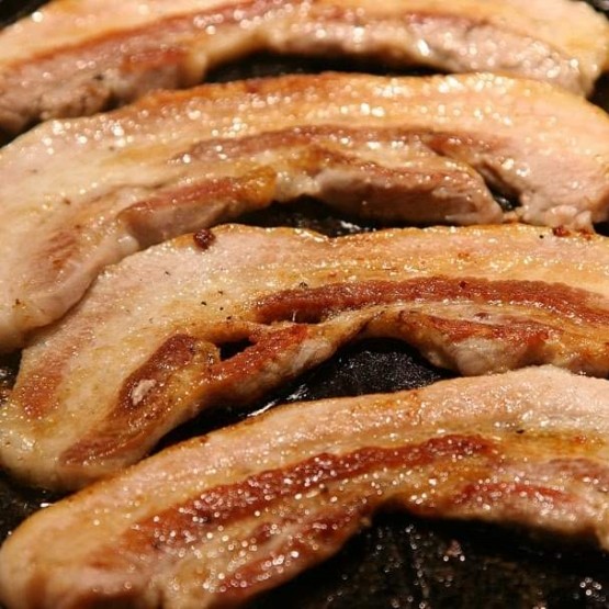 香ばしく焼いた厚切り豚バラ肉を、サンチュに包んでがぶりっ!!